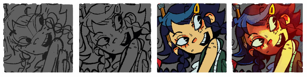 - when creating a commission i typically send updates after the sketch, lineart, and flat colors.- at any time before completion the client may request changes.- after completion i request an email to send the finished product to.- as i'm still in school, it can take me a few weeks to roughly 3 months to finish a piece.
